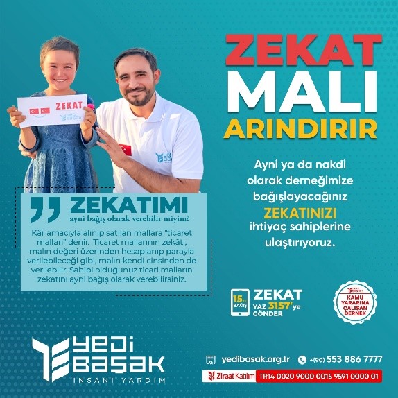 Zekât dinimizin beş temel ibadetlerindendir. Zekât, belirli malların (altın, gümüş, ticaret malı, nakit paranın belirli bir miktarı) belli oranlarını içerir. Örneğin, altın ve gümüş için oranlar %2,5, ticaret malları için %2,5’dir. Zekâtın doğru hesaplanması için mal sahibi, sahip olduğu mülk ve varlıkların değerini bilmelidir. Zekât vermek malımızın artmasına, korunmasına, bereketlenmesine vesile olur. Bu ibadet madden yapılan ibadetler arasına girmektedir. Bu ibadet, bizler için önemli bir sosyal sorumluluk ve dayanışma aracıdır. Zekat bağışlarınız, yurt içinde ve yurt dışında birçok farklı bölgedeki ihtiyaç sahiplerine umut olabilir.